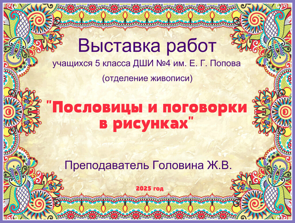 В Детской школе искусств № 4 открылась выставка работ учащихся 5 класса отделения живописи. Экспозиция называется «Пословицы и поговорки в рисунках» и организована преподавателем Ж. В. Головиной.